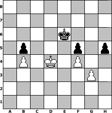 game notation in PGN-format [Event "Tigran (Wartanowitsch)Petrosjan Turnier"] [Site "www.myChess.de"] [Date "2009.08.09"] [Round "1"] [White "rgHD"] [Black "Papale"] [ECO "A11"] [WhitemyELO "1515"] [BlackmyELO "1733"] [Result "1/2-1/2"] [TimeControl "10/2592000"] [WhiteDays "149"] [BlackDays "169"] [MyChessNo "58136"] 1. c4 c6 2. g3 d5 3. cxd5 cxd5 4. Bg2 Nf6 5. d4 e6 6. Bg5 Be7 7. Nc3 O-O 8. Nf3 h6 9. Bf4 b6 10. Rc1 Bb7 11. O-O Nc6 12. a3 Na5 13. Ne5 Nd7 14. e4 Nxe5 15. Bxe5 dxe4 16. Nxe4 Rc8 17. Qg4 g6 18. h4 Nc4 19. Nf6+ Bxf6 20. Bxf6 Qxf6 21. Bxb7 Rb8 22. Rxc4 Rxb7 23. Rd1 Rd7 24. h5 Rfd8 25. hxg6 Qxg6 26. Qf4 Qg5 27. Qf3 Kf8 28. Kf1 Ke7 29. d5 e5 30. Rc6 Rd6 31. Rc7+ R8d7 32. Rxd7+ Rxd7 33. d6+ Kf8 34. Qc6 Qd8 35. Qd5 Qe8 36. Re1 Qe6 37. Qxe5 Qxe5 38. Rxe5 Rxd6 39. Ke2 Rc6 40. Kf3 Rc2 41. Rb5 Ke7 42. Re5+ Kf6 43. Re2 Rxe2 44. Kxe2 Ke5 45. Ke3 b5 46. b3 a5 47. b4 axb4 48. axb4 h5 49. f3 f5 50. f4+ Ke6 51. Kd4 1/2-1/2 position notation in FEN-format 8/8/4k3/1p3p1p/1P1K1P2/6P1/8/8 - - - 2 51 Captured white pieces: Captured black pieces: Click on a captured piece in order to display the desired move!