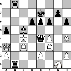 game notation in PGN-format [Event "960er Sommer Turnier"] [Site "www.myChess.de"] [Date "2006.05.20"] [Round "2"] [White "chrisrockdsc"] [Black "zoli"] [Variant "Fischerrandom"] [SetUp "1"] [FEN "qbrkbrnn/pppppppp/8/8/8/8/PPPPPPPP/QBRKBRNN w KQkq - 0 1"] [WhitemyELO "1430"] [BlackmyELO "1625"] [Result "0-1"] [TimeControl "10/864000"] [WhiteDays "10"] [BlackDays "10"] [MyChessNo "25608"] 1. Nf3 Nf6 2. b4 Ng6 3. Ne5 Nxe5 4. Qxe5 b6 5. Ng3 Qxg2 6. Nf5 e6 7. Ne3 Qh3 8. c4 h6 9. f4 d6 10. Qd4 c5 11. bxc5 Ba4+ 12. Bc2 bxc5 13. Qb2 Bxc2+ 14. Rxc2 Ke8 15. Qb5+ Kd8 16. Rc3 Ng4 17. Rf3 Nxe3+ 18. Rcxe3 Qf5 19. Bh4+ f6 20. Qa5+ Bc7 21. Qc3 Rb8 22. d3 Ke7 23. Qa3 Rb1+ 24. Kc2 Rfb8 25. Kc3 a5 26. d4 cxd4+ 27. Kxd4 Bb6+ 28. c5 Bxc5+ 29. Kc4 Qc2+ 30. Rc3 Qe4# 0-1 position notation in FEN-format 1r6/4k1p1/3ppp1p/p1b5/2K1qP1B/Q1R2R2/P3P2P/1r4N1 - - - 4 31 Captured white pieces: Captured black pieces: Click on a captured piece in order to display the desired move!