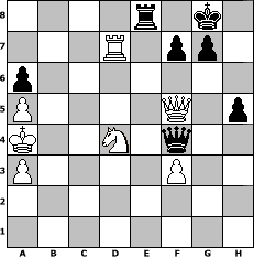 game notation in PGN-format [Event "Superzelle"] [Site "www.myChess.de"] [Date "2009.03.31"] [Round "1"] [White "bruno"] [Black "Ziegert"] [ECO "A13"] [WhitemyELO "1701"] [BlackmyELO "1635"] [Result "1-0"] [TimeControl "10/2592000"] [WhiteDays "30"] [BlackDays "28"] [MyChessNo "54401"] 1. c4 e6 2. Nc3 d5 3. Nf3 Nf6 4. e3 c5 5. d4 Be7 6. cxd5 exd5 7. Bb5+ Bd7 8. O-O O-O 9. dxc5 Bxb5 10. Nxb5 Bxc5 11. b3 a6 12. Nc3 Nc6 13. a3 Rc8 14. b4 Bb6 15. Re1 Re8 16. Na4 Ba7 17. Nc5 Qd6 18. Nxb7 Qe7 19. Na5 Nxa5 20. bxa5 Qc5 21. Bb2 Ne4 22. Bd4 Qc7 23. Rc1 Qe7 24. Bxa7 Qxa7 25. Qxd5 Rxc1 26. Rxc1 Qe7 27. Qb3 h6 28. Nd4 Qf6 29. f3 Nd6 30. Rc6 Qe5 31. Kf2 Qxh2 32. Qd5 Qh4+ 33. Ke2 Qg3 34. Rxd6 Qxg2+ 35. Kd3 Qf1+ 36. Kc2 Qf2+ 37. Kb3 Qxe3+ 38. Ka4 Qd3 39. Qb3 Qd2 40. Qc2 Qf4 41. Rd7 h5 42. Qf5 1-0 position notation in FEN-format 4r1k1/3R1pp1/p7/P4Q1p/K2N1q2/P4P2/8/8 - - - 1 42 Captured white pieces: Captured black pieces: Click on a captured piece in order to display the desired move!