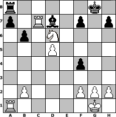 game notation in PGN-format [Event "MySchachOpen"] [Site "www.myChess.de"] [Date "2005.01.22"] [Round "2"] [White "Pinguin"] [Black "PublicEnemy"] [ECO "B13"] [WhitemyELO "1502"] [BlackmyELO "1233"] [Result "1-0"] [TimeControl "10/2592000"] [WhiteDays "87"] [BlackDays "00"] [MyChessNo "9959"] 1. e4 c6 2. d4 d5 3. exd5 cxd5 4. c4 dxc4 5. Bxc4 e6 6. Nf3 Bd6 7. Nc3 Nf6 8. Bg5 O-O 9. O-O Nc6 10. Re1 Na5 11. Bd3 Be7 12. Nb5 Bb4 13. Re2 Qd5 14. Bxf6 gxf6 15. Nc7 Qd6 16. Nxa8 Bd7 17. a3 Rxa8 18. axb4 Qxb4 19. Qd2 Qxd2 20. Nxd2 Nc6 21. Nb3 e5 22. d5 Nb4 23. Nc5 Nxd3 24. Nxd3 Bb5 25. Rd2 e4 26. Nc5 b6 27. Nxe4 f5 28. Nd6 Bd7 29. Rc2 f4 30. Rc7 1-0 position notation in FEN-format r5k1/p1Rb1p1p/1p1N4/3P4/5p2/8/1P3PPP/R5K1 - - - 1 30 Captured white pieces: Captured black pieces: Click on a captured piece in order to display the desired move!