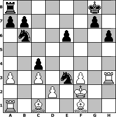 game notation in PGN-format [Event "Mit Freude am Spiel 2..!"] [Site "www.myChess.de"] [Date "2014.11.15"] [Round "1"] [White "muellerh"] [Black "Knight"] [ECO "?"] [WhitemyELO "1471"] [BlackmyELO "1290"] [Result "1-0"] [TimeControl "10/864000"] [WhiteDays "10"] [BlackDays "10"] [MyChessNo "96652"] 1. d4 Nf6 2. c4 e6 3. Nc3 Bb4 4. a3 Bxc3+ 5. bxc3 d5 6. cxd5 O-O 7. dxe6 Bxe6 8. Nf3 c6 9. e3 Nbd7 10. Be2 Re8 11. O-O c5 12. Bb2 c4 13. Qc2 Nb6 14. Rfe1 Bg4 15. h3 Bd7 16. Ne5 Qc8 17. e4 Bxh3 18. gxh3 Qxh3 19. Bf3 Re6 20. Bg2 Qh4 21. Re3 Rxe5 22. dxe5 Ng4 23. Rh3 Qg5 24. e6 fxe6 25. e5 h6 26. Bc1 Qxe5 27. f3 Qe1+ 28. Bf1 Ne3 29. Qf2 Qxf2+ 30. Kxf2 1-0 position notation in FEN-format r5k1/pp4p1/1n2p2p/8/2p5/P1P1nP1R/3P1K2/R1B2B2 - - - 0 30 Captured white pieces: Captured black pieces: Click on a captured piece in order to display the desired move!