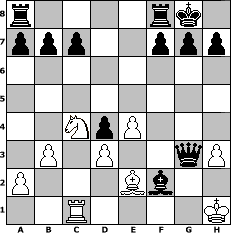 game notation in PGN-format [Event "around 1510"] [Site "www.myChess.de"] [Date "2005.03.07"] [Round "1"] [White "Caligula"] [Black "Jonas84"] [ECO "C44"] [WhitemyELO "1383"] [BlackmyELO "1421"] [Result "0-1"] [TimeControl "10/864000"] [WhiteDays "10"] [BlackDays "10"] [MyChessNo "10949"] 1. e4 e5 2. Nf3 Nc6 3. c3 Nf6 4. d3 d5 5. Bg5 Be7 6. Be2 O-O 7. O-O d4 8. Bxf6 Bxf6 9. cxd4 Nxd4 10. Nxd4 exd4 11. Nd2 Be6 12. Rc1 Qd6 13. b3 Be5 14. f4 Bxf4 15. Nc4 Bxh2+ 16. Kh1 Qg3 17. Rf3 Qh4 18. Qe1 Bg3+ 19. Kg1 Bxe1 20. Rh3 Bxh3 21. gxh3 Qg3+ 22. Kh1 Bf2 0-1 position notation in FEN-format r4rk1/ppp2ppp/8/8/2NpP3/1P1P2qP/P3Bb2/2R4K - - - 3 23 Captured white pieces: Captured black pieces: Click on a captured piece in order to display the desired move!