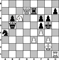 game notation in PGN-format [Event "Arpad Elo Geburtstagstunier"] [Site "www.myChess.de"] [Date "2011.08.23"] [Round "1"] [White "nogumo"] [Black "espero"] [ECO "A00"] [WhitemyELO "1684"] [BlackmyELO "1668"] [Result "1-0"] [TimeControl "10/1728000"] [WhiteDays "20"] [BlackDays "20"] [MyChessNo "75713"] 1. b4 f5 2. Bb2 Nf6 3. e3 g6 4. Bxf6 exf6 5. b5 a6 6. c4 axb5 7. cxb5 d5 8. Nf3 c5 9. Be2 Bd6 10. Nc3 Be6 11. O-O O-O 12. a4 b6 13. d4 Nd7 14. dxc5 Nxc5 15. Nxd5 Bxh2+ 16. Kxh2 Bxd5 17. Nd4 Re8 18. Bf3 Bxf3 19. Qxf3 Rxa4 20. Rxa4 Nxa4 21. Nc6 Qc7+ 22. g3 Re4 23. Qd1 Kg7 24. Qc2 Qf7 25. Ra1 Qc4 26. Qd1 Qxb5 27. Qd7+ Kh6 28. Kg2 Re7 29. Rh1+ Kg5 30. f4+ 1-0 position notation in FEN-format 8/3Qr2p/1pN2pp1/1q3pk1/n4P2/4P1P1/6K1/7R - - - 0 30 Captured white pieces: Captured black pieces: Click on a captured piece in order to display the desired move!