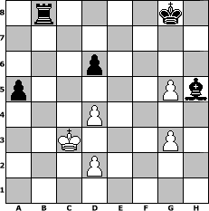 game notation in PGN-format [Event "Februar 2018"] [Site "www.myChess.de"] [Date "2018.02.03"] [Round "1"] [White "borsti"] [Black "sprinterde"] [ECO "D00"] [WhitemyELO "1233"] [BlackmyELO "1690"] [Result "0-1"] [TimeControl "10/1728000"] [WhiteDays "100"] [BlackDays "099"] [MyChessNo "111285"] 1. d4 d5 2. Bf4 Nf6 3. e3 h6 4. Nc3 Nc6 5. Bb5 a6 6. Ba4 b5 7. Bb3 Bb7 8. Nf3 g5 9. Bg3 Bg7 10. O-O Nh5 11. Ne2 Na5 12. c3 O-O 13. Bc2 g4 14. Nh4 Bc8 15. Nf4 Nxf4 16. Bxf4 f5 17. f3 e5 18. Bxe5 Qxh4 19. Bg3 Qd8 20. Qd3 h5 21. fxg4 hxg4 22. Rf4 Bh6 23. Rf2 Nc4 24. b3 Nxe3 25. Bf4 Nxc2 26. Qxc2 Bxf4 27. Rxf4 Qg5 28. g3 Bd7 29. Re1 Rae8 30. Qc1 Re4 31. Rfxe4 Qxc1 32. Rxc1 fxe4 33. c4 bxc4 34. bxc4 e3 35. Re1 Rf3 36. cxd5 Bb5 37. Kg2 e2 38. a4 Bc4 39. d6 cxd6 40. h3 Rf1 41. Rxe2 Bxe2 42. hxg4 Ra1 43. g5 Rxa4 44. Kf2 Bh5 45. Ke3 Rb4 46. Kd3 a5 47. Kc3 Rb8 0-1 position notation in FEN-format 1r4k1/8/3p4/p5Pb/3P4/2K3P1/3P4/8 - - - 2 48 Captured white pieces: Captured black pieces: Click on a captured piece in order to display the desired move!