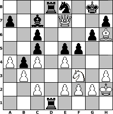 game notation in PGN-format [Event "COS Clubmeisterschaft 2012"] [Site "www.myChess.de"] [Date "2012.05.04"] [Round "1"] [White "ClaudiaN"] [Black "martinus"] [ECO "B31"] [WhitemyELO "1937"] [BlackmyELO "1705"] [Result "1-0"] [TimeControl "10/2592000"] [WhiteDays "88"] [BlackDays "80"] [MyChessNo "81563"] 1. e4 c5 2. Nf3 Nc6 3. Bb5 g6 4. Bxc6 dxc6 5. d3 Bg7 6. h3 Nf6 7. O-O O-O 8. Nc3 b5 9. a3 Qc7 10. Bg5 Rd8 11. Qd2 e5 12. Qe3 Qd6 13. a4 b4 14. Nb1 Be6 15. Nbd2 Rd7 16. Rad1 Ne8 17. Nc4 Bxc4 18. dxc4 Qxd1 19. Rxd1 Rxd1+ 20. Kh2 Bf8 21. Bh6 Bd6 22. b3 Rd8 23. Qg5 f6 24. Qg4 f5 25. Qg5 Bc7 26. Qe7 1-0 position notation in FEN-format 3rn1k1/p1b1Q2p/2p3pB/2p1pp2/PpP1P3/1P3N1P/2P1PPPK/3r4 - - - 3 26 Captured white pieces: Captured black pieces: Click on a captured piece in order to display the desired move!