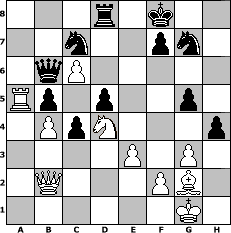 game notation in PGN-format [Event "Novembernebel"] [Site "www.myChess.de"] [Date "2014.10.16"] [Round "2"] [White "HPB2005"] [Black "haggard"] [ECO "A61"] [WhitemyELO "1902"] [BlackmyELO "1976"] [Result "1/2-1/2"] [TimeControl "10/2592000"] [WhiteDays "22"] [BlackDays "30"] [MyChessNo "96390"] 1. d4 Nf6 2. c4 c5 3. d5 e6 4. Nc3 exd5 5. cxd5 d6 6. Nf3 g6 7. Bf4 Bg7 8. Qa4+ Bd7 9. Qb3 Qc7 10. Nd2 O-O 11. Nc4 Ne8 12. h4 h6 13. g3 Na6 14. Bg2 Rd8 15. a3 Qb8 16. O-O b5 17. Na5 Nac7 18. Rfd1 Kh7 19. h5 g5 20. Qc2+ Kh8 21. Bc1 Nf6 22. Nc6 Bxc6 23. dxc6 Rfe8 24. b4 Kg8 25. e3 c4 26. Ra2 a6 27. a4 Qb6 28. Bb2 d5 29. Ne2 Nxh5 30. axb5 axb5 31. Bxg7 Nxg7 32. Nd4 Ra8 33. Rda1 Rxa2 34. Rxa2 h5 35. Qd2 Rd8 36. Ra5 Kf8 37. Qb2 h4 1/2-1/2 position notation in FEN-format 3r1k2/2n2pn1/1qP5/Rp1p2p1/1PpN3p/4P1P1/1Q3PB1/6K1 - - - 0 38 Captured white pieces: Captured black pieces: Click on a captured piece in order to display the desired move!