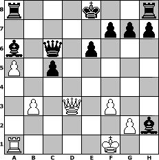 game notation in PGN-format [Event "F"] [Site "www.myChess.de"] [Date "2005.03.08"] [Round "2"] [White "OwainGwynedd"] [Black "Devine"] [ECO "A57"] [WhitemyELO "1110"] [BlackmyELO "1600"] [Result "0-1"] [TimeControl "10/1728000"] [WhiteDays "60"] [BlackDays "58"] [MyChessNo "11015"] 1. d4 Nf6 2. c4 c5 3. d5 b5 4. cxb5 a6 5. Nc3 axb5 6. Nxb5 Qa5+ 7. Nc3 Bb7 8. Bd2 Qb6 9. Na4 Qa7 10. Nf3 Qxa4 11. b3 Qa3 12. Bc1 Qb4+ 13. Bd2 Qb6 14. Bc3 Nxd5 15. Bd2 Nf6 16. e3 e6 17. Ne5 d5 18. a4 Bd6 19. Bb5+ Nc6 20. a5 Qxb5 21. Nxc6 Qxc6 22. O-O d4 23. f3 dxe3 24. Bxe3 Bxh2+ 25. Kf2 Ng4+ 26. Ke1 Nxe3 27. Qd3 Nxf1 28. Kxf1 Ba6 0-1 position notation in FEN-format r3k2r/5ppp/b1q1p3/P1p5/8/1P1Q1P2/6Pb/R4K2 - kq - 1 29 Captured white pieces: Captured black pieces: Click on a captured piece in order to display the desired move!