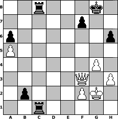 game notation in PGN-format [Event "April 2018"] [Site "www.myChess.de"] [Date "2018.04.11"] [Round "1"] [White "wolni55"] [Black "Joschi"] [ECO "B12"] [WhitemyELO "1415"] [BlackmyELO "1528"] [Result "0-1"] [TimeControl "10/1728000"] [WhiteDays "078"] [BlackDays "100"] [MyChessNo "111969"] 1. e4 c6 2. d4 d5 3. e5 Bf5 4. Bd3 Bxd3 5. Qxd3 e6 6. a3 Nd7 7. Nf3 Ne7 8. Bf4 a6 9. Nbd2 c5 10. dxc5 Nxc5 11. Qe2 Nc6 12. O-O Be7 13. h3 Rc8 14. Rfd1 O-O 15. Nc4 b5 16. Nd6 Bxd6 17. exd6 Ne4 18. c3 Nxd6 19. b4 Ne4 20. Rd3 Nf6 21. a4 Qb6 22. Be3 Qb8 23. a5 Ne5 24. Nxe5 Qxe5 25. Qc2 Ne4 26. Bd4 Qd6 27. Re3 e5 28. Bb6 Qxb4 29. Rb1 Qd6 30. Rd1 Nf6 31. Qb3 Rc6 32. Red3 Rfc8 33. g4 h6 34. Re1 Qb8 35. Be3 e4 36. Rdd1 Rxc3 37. Qb1 b4 38. Bd4 Rc2 39. Bxf6 gxf6 40. Rxd5 Qf4 41. Rf5 Qd2 42. Kg2 e3 43. Rxe3 Qxe3 44. Rxf6 b3 45. Rf3 Rc1 46. Qf5 Qxf3+ 47. Qxf3 b2 0-1 position notation in FEN-format 2r3k1/5p2/p6p/P7/6P1/5Q1P/1p3PK1/2r5 - - - 0 48 Captured white pieces: Captured black pieces: Click on a captured piece in order to display the desired move!