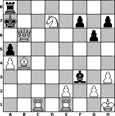 game notation in PGN-format [Event "?"] [Site "www.myChess.de"] [Date "2024.10.18"] [Round "?"] [White "kalle"] [Black "Achimkogge"] [ECO "C41"] [WhitemyELO "1607"] [BlackmyELO "1309"] [Result "1-0"] [TimeControl "10/2592000"] [WhiteDays "119"] [BlackDays "119"] [MyChessNo "132425"] 1. e4 e5 2. Nf3 d6 3. Bc4 c6 4. O-O Bg4 5. c3 b5 6. Bb3 Nf6 7. d3 a5 8. a4 b4 9. Be3 bxc3 10. bxc3 d5 11. exd5 cxd5 12. Nbd2 Nc6 13. Qc2 Bd6 14. h3 Bf5 15. Nh4 Be6 16. f4 e4 17. dxe4 d4 18. cxd4 g6 19. d5 Nb4 20. Qc3 Nxe4 21. Qxh8+ Bf8 22. Nxe4 Nxd5 23. Bxd5 Qxd5 24. Bc5 Kd7 25. Nf6+ Kc6 26. Bxf8 Qd4+ 27. Kh1 Bc4 28. Nf3 Qxf4 29. Rac1 Kb7 30. Rfe1 Ka6 31. Ne4 Bd5 32. Nc5+ Kb6 33. Qb2+ Qb4 34. Nd7+ Ka6 35. Bxb4 Bxf3 36. Qf6+ Ka7 37. Qb6# 1-0 position notation in FEN-format r7/k2N1p1p/1Q4p1/p7/PB6/5b1P/4P1P1/2R1R2K - - - 3 37 Captured white pieces: Captured black pieces: Click on a captured piece in order to display the desired move!