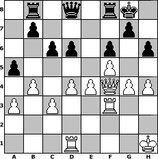 game notation in PGN-format [Event "Gegen die Herbstdepression"] [Site "www.myChess.de"] [Date "2008.12.01"] [Round "2"] [White "andreas007"] [Black "alpacino"] [ECO "C70"] [WhitemyELO "1402"] [BlackmyELO "1362"] [Result "1/2-1/2"] [TimeControl "10/864000"] [WhiteDays "10"] [BlackDays "10"] [MyChessNo "50381"] 1. e4 e5 2. Nf3 Nc6 3. Bb5 a6 4. Ba4 Bd6 5. O-O Nf6 6. Nc3 O-O 7. d3 Nd4 8. Be3 Nxf3+ 9. Qxf3 c6 10. Bb3 Qe7 11. Qg3 Nh5 12. Qg4 Nf6 13. Qg3 Nh5 14. Qg4 Nf6 15. Qe2 Bc7 16. Bg5 d6 17. Rad1 Be6 18. Bxe6 Qxe6 19. Kh1 Ng4 20. h3 Nf6 21. f4 Bd8 22. f5 Qd7 23. Bxf6 Bxf6 24. g4 h6 25. b4 Rab8 26. Qg2 Qe7 27. Ne2 Qd8 28. Ng3 Qe7 29. c3 Qd8 30. Nh5 Bg5 31. Rf3 f6 32. Qg3 Qe7 33. h4 Bf4 34. Nxf4 exf4 35. Qxf4 Qd8 36. d4 a5 37. a3 1/2-1/2 position notation in FEN-format 1r1q1rk1/1p4p1/2pp1p1p/p4P2/1P1PPQPP/P1P2R2/8/3R3K - - - 0 37 Captured white pieces: ![]() ![]() ![]() ![]() ![]() ![]() ![]() ![]() ![]() ![]() ![]() ![]() ![]() ![]() ![]() Captured black pieces: ![]() ![]() ![]() ![]() ![]() ![]() ![]() ![]() ![]() ![]() ![]() ![]() ![]() ![]() ![]() Click on a captured piece in order to display the desired move!