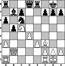 game notation in PGN-format [Event "Wann wird es Sommer?"] [Site "www.myChess.de"] [Date "2009.07.20"] [Round "1"] [White "rkoelbach"] [Black "Haki"] [ECO "A00"] [WhitemyELO "1451"] [BlackmyELO "1504"] [Result "1-0"] [TimeControl "10/2592000"] [WhiteDays "25"] [BlackDays "30"] [MyChessNo "57673"] 1. b4 e5 2. Bb2 Bxb4 3. Bxe5 Nf6 4. c4 O-O 5. Nf3 Nc6 6. Bb2 d5 7. e3 dxc4 8. Bxc4 a6 9. a3 Ba5 10. O-O b5 11. Be2 Re8 12. d4 Ne4 13. Nbd2 Bc3 14. Qc2 Nxd2 15. Nxd2 Bxb2 16. Qxb2 Qg5 17. Bf3 Bb7 18. Ne4 Qd8 19. Nc5 1-0 position notation in FEN-format r2qr1k1/1bp2ppp/p1n5/1pN5/3P4/P3PB2/1Q3PPP/R4RK1 - - - 6 19 Captured white pieces: Captured black pieces: Click on a captured piece in order to display the desired move!