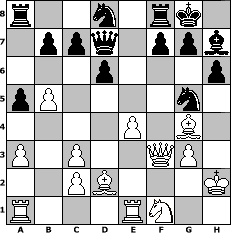 game notation in PGN-format [Event "FSO1-1-45"] [Site "www.myChess.de"] [Date "2005.05.26"] [Round "1"] [White "karpov"] [Black "Dragonwolves"] [ECO "C49"] [WhitemyELO "2072"] [BlackmyELO "2010"] [Result "1/2-1/2"] [TimeControl "10/2592000"] [WhiteDays "30"] [BlackDays "27"] [MyChessNo "13583"] 1. e4 e5 2. Nf3 Nc6 3. Nc3 Nf6 4. Bb5 Bb4 5. a3 Bxc3 6. dxc3 d6 7. Qe2 h6 8. O-O O-O 9. Bd2 Bg4 10. Rfe1 Nd7 11. h3 Bh5 12. Qe3 Bg6 13. Bd3 Nc5 14. b4 Ne6 15. Nh2 Qh4 16. Nf1 Nf4 17. g3 Nxh3+ 18. Kh2 Qg4 19. Be2 Qd7 20. f4 Bh7 21. Bh5 a5 22. b5 Nd8 23. Qe2 exf4 24. Bg4 f3 25. Qxf3 Ng5 1/2-1/2 position notation in FEN-format r2n1rk1/1ppq1ppb/3p3p/pP4n1/4P1B1/P1P2QP1/2PB3K/R3RN2 - - - 1 26 Captured white pieces: Captured black pieces: Click on a captured piece in order to display the desired move!