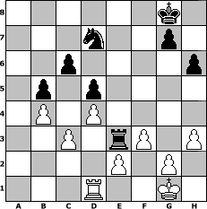 game notation in PGN-format [Event "Gegen die Herbstdepression"] [Site "www.myChess.de"] [Date "2008.12.01"] [Round "1"] [White "Helmut48"] [Black "babikar"] [ECO "C24"] [WhitemyELO "1394"] [BlackmyELO "1376"] [Result "0-1"] [TimeControl "10/864000"] [WhiteDays "10"] [BlackDays "10"] [MyChessNo "50347"] 1. e4 e5 2. Bc4 Nf6 3. d3 Bc5 4. Bg5 h6 5. Bxf6 Qxf6 6. Qf3 Qxf3 7. Nxf3 O-O 8. Nxe5 Bd4 9. c3 Bxe5 10. O-O Nc6 11. Nd2 d6 12. h3 Be6 13. Bxe6 fxe6 14. Nc4 d5 15. Nxe5 Nxe5 16. Rad1 b5 17. exd5 exd5 18. b4 c6 19. f3 a5 20. Rfe1 Nd7 21. a3 axb4 22. axb4 Rfe8 23. Rxe8+ Rxe8 24. d4 Re3 0-1 position notation in FEN-format 6k1/3n2p1/2p4p/1p1p4/1P1P4/2P1rP1P/4P1P1/3R2K1 - - - 1 25 Captured white pieces: ![]() ![]() ![]() ![]() ![]() ![]() ![]() ![]() ![]() ![]() ![]() ![]() ![]() ![]() ![]() Captured black pieces: ![]() ![]() ![]() ![]() ![]() ![]() ![]() ![]() ![]() ![]() ![]() ![]() ![]() ![]() ![]() Click on a captured piece in order to display the desired move!