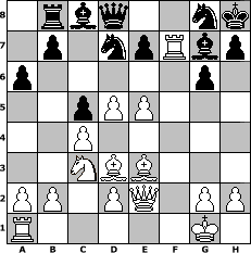 game notation in PGN-format [Event "Albspiele 5"] [Site "www.myChess.de"] [Date "2010.07.03"] [Round "1"] [White "Haneken"] [Black "lasker"] [ECO "E76"] [WhitemyELO "1582"] [BlackmyELO "1378"] [Result "1-0"] [TimeControl "10/1728000"] [WhiteDays "08"] [BlackDays "00"] [MyChessNo "66751"] 1. d4 Nf6 2. c4 g6 3. Nc3 Bg7 4. e4 d6 5. f4 O-O 6. Nf3 c5 7. d5 Nbd7 8. Bd3 Rb8 9. O-O a6 10. Qe2 Re8 11. Be3 Kh8 12. e5 dxe5 13. fxe5 Ng8 14. Ng5 Rf8 15. Nxf7+ Rxf7 16. Rxf7 1-0 position notation in FEN-format 1rbq2nk/1p1npRbp/p5p1/2pPP3/2P5/2NBB3/PP1PQ1PP/R5K1 - - - 0 16 Captured white pieces: Captured black pieces: Click on a captured piece in order to display the desired move!