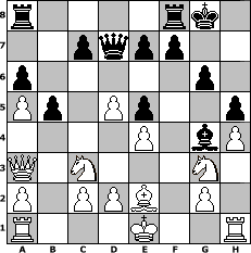 game notation in PGN-format [Event "Anti Fritz8 Turnier"] [Site "www.myChess.de"] [Date "2006.05.02"] [Round "2"] [White "Juri"] [Black "FreshPrinc2"] [ECO "A40"] [WhitemyELO "1499"] [BlackmyELO "1599"] [Result "1-0"] [TimeControl "10/864000"] [WhiteDays "09"] [BlackDays "10"] [MyChessNo "25109"] 1. d4 g6 2. e4 Bh6 3. Ne2 Bxc1 4. Qxc1 Nc6 5. b3 Nf6 6. e5 Ne4 7. f3 d6 8. fxe4 dxe5 9. d5 Na5 10. Ng3 h5 11. h4 b6 12. Qa3 O-O 13. Nc3 Qd6 14. b4 Bg4 15. Nb5 Qd7 16. bxa5 a6 17. Nc3 b5 18. Be2 1-0 position notation in FEN-format r4rk1/2pqpp2/p5p1/Pp1Pp2p/4P1bP/Q1N3N1/P1PPB1P1/R3K2R - KQ - 1 18 Captured white pieces: Captured black pieces: Click on a captured piece in order to display the desired move!