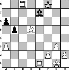 game notation in PGN-format [Event "Weihnachtsturnier 2012"] [Site "www.myChess.de"] [Date "2012.12.18"] [Round "1"] [White "reisender"] [Black "borsti"] [ECO "D00"] [WhitemyELO "1409"] [BlackmyELO "1254"] [Result "1-0"] [TimeControl "10/864000"] [WhiteDays "09"] [BlackDays "10"] [MyChessNo "85571"] 1. d4 d5 2. e3 a6 3. Nf3 Bg4 4. Be2 Bxf3 5. Bxf3 e6 6. O-O Nf6 7. Nd2 Bd6 8. a3 Nc6 9. c4 O-O 10. c5 Be7 11. Qb3 Rb8 12. Qd3 h6 13. b4 Qd7 14. e4 b5 15. e5 Nh7 16. Bh5 f5 17. Qg3 Nxd4 18. Nf3 Nb3 19. Bxh6 Bd8 20. Rab1 Nxc5 21. bxc5 c6 22. Nd4 Kh8 23. Bf4 Rc8 24. Bg6 Qe7 25. Qh3 Qh4 26. Qxh4 Bxh4 27. Nxe6 Rb8 28. Nxf8 Rxf8 29. Rfe1 Rd8 30. e6 Rc8 31. Bxf5 Nf6 32. e7 Kg8 33. Bxc8 Kf7 34. Bb7 Ne4 35. g3 Bxe7 36. Bxc6 Nxc5 37. Bxd5+ Kf8 38. Rbc1 g5 39. Bxg5 Bxg5 40. Rxc5 Be7 41. Rc8+ 1-0 position notation in FEN-format 2R2k2/4b3/p7/1p1B4/8/P5P1/5P1P/4R1K1 - - - 2 41 Captured white pieces: Captured black pieces: Click on a captured piece in order to display the desired move!