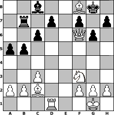 game notation in PGN-format [Event "Albspiele 21"] [Site "www.myChess.de"] [Date "2012.05.10"] [Round "1"] [White "JerryWho"] [Black "MiFie"] [ECO "A40"] [WhitemyELO "1597"] [BlackmyELO "1335"] [Result "1-0"] [TimeControl "10/1728000"] [WhiteDays "20"] [BlackDays "20"] [MyChessNo "81673"] 1. d4 Nc6 2. Nf3 e6 3. e3 Bb4+ 4. c3 Bd6 5. Bd3 Nf6 6. e4 O-O 7. e5 Be7 8. exf6 Bxf6 9. O-O g6 10. Bh6 Re8 11. Nbd2 e5 12. Nxe5 Nxe5 13. dxe5 Bxe5 14. Nf3 Bf6 15. Re1 b6 16. Be4 Rb8 17. Qa4 a5 18. Rad1 c6 19. Bc2 b5 20. Rxe8+ Qxe8 21. Qf4 Rb7 22. Qxf6 Qf8 23. Bxf8 1-0 position notation in FEN-format 2b2Bk1/1r1p1p1p/2p2Qp1/pp6/8/2P2N2/PPB2PPP/3R2K1 - - - 0 23 Captured white pieces: Captured black pieces: Click on a captured piece in order to display the desired move!