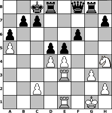 game notation in PGN-format [Event "Mittelklasse-Turnier"] [Site "www.myChess.de"] [Date "2007.10.20"] [Round "1"] [White "Knight"] [Black "bruno"] [ECO "D00"] [WhitemyELO "1298"] [BlackmyELO "1425"] [Result "0-1"] [TimeControl "10/864000"] [WhiteDays "10"] [BlackDays "10"] [MyChessNo "39096"] 1. d4 d5 2. e4 e6 3. Nc3 Nc6 4. e5 f6 5. Bb5 Bd7 6. Nf3 Bb4 7. O-O Nge7 8. exf6 gxf6 9. Bh6 Nf5 10. Nd2 Nxh6 11. Qh5+ Nf7 12. Nf3 Bd6 13. Rfe1 Qe7 14. Bxc6 Bxc6 15. a3 O-O-O 16. b4 a6 17. a4 Bxb4 18. Re3 Bxc3 19. Rxc3 Be8 20. a5 Nd6 21. Qg4 Bg6 22. Re3 Bf5 23. Qg3 Rhg8 24. Qh4 Qf8 25. g3 Ne4 26. Rae1 Rg4 27. Qh5 Rg8 28. Nh4 Bg4 29. Qxg4 Rxg4 30. f3 Rg8 31. fxe4 e5 0-1 position notation in FEN-format 2kr1qr1/1pp4p/p4p2/P2pp3/3PP2N/4R1P1/2P4P/4R1K1 - - - 0 32 Captured white pieces: Captured black pieces: Click on a captured piece in order to display the desired move!