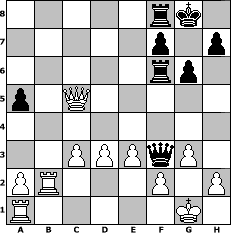 game notation in PGN-format [Event "Gl"] [Site "www.myChess.de"] [Date "2012.06.07"] [Round "1"] [White "espero"] [Black "Haki"] [ECO "A05"] [WhitemyELO "1679"] [BlackmyELO "1333"] [Result "1-0"] [TimeControl "10/2592000"] [WhiteDays "73"] [BlackDays "90"] [MyChessNo "82054"] 1. Nf3 Nf6 2. g3 g6 3. Bg2 Bg7 4. O-O O-O 5. c4 c5 6. Nc3 Nc6 7. d3 d5 8. cxd5 Nxd5 9. Bd2 Nxc3 10. Bxc3 Bxc3 11. bxc3 b5 12. Ne5 Bb7 13. Nxc6 Qc7 14. Nxe7+ Qxe7 15. Bxb7 Qxb7 16. Qb3 Rae8 17. e3 a5 18. Rfb1 Qf3 19. Qxb5 Re6 20. Qxc5 Rf6 21. Rb2 1-0 position notation in FEN-format 5rk1/5p1p/5rp1/p1Q5/8/2PPPqP1/PR3P1P/R5K1 - - - 2 21 Captured white pieces: ![]() ![]() ![]() ![]() ![]() ![]() ![]() ![]() ![]() ![]() ![]() ![]() ![]() ![]() ![]() Captured black pieces: ![]() ![]() ![]() ![]() ![]() ![]() ![]() ![]() ![]() ![]() ![]() ![]() ![]() ![]() ![]() Click on a captured piece in order to display the desired move!