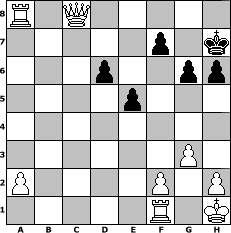 game notation in PGN-format [Event "Fernschach f"] [Site "www.myChess.de"] [Date "2008.04.06"] [Round "1"] [White "Papale"] [Black "Steppenwolf"] [ECO "A00"] [WhitemyELO "1771"] [BlackmyELO "1435"] [Result "1-0"] [TimeControl "10/864000"] [WhiteDays "10"] [BlackDays "10"] [MyChessNo "44121"] 1. a3 e5 2. c4 d5 3. cxd5 Qxd5 4. Nc3 Qd8 5. g3 Nc6 6. Bg2 Nf6 7. d3 Bf5 8. Nf3 Bd6 9. O-O O-O 10. Bg5 h6 11. Bxf6 Qxf6 12. Nd2 Nd4 13. Nde4 Bxe4 14. Nxe4 Qe6 15. Nxd6 cxd6 16. Bxb7 Rab8 17. Bg2 Rxb2 18. Qa4 Nxe2+ 19. Kh1 Rd2 20. Qxa7 Rxd3 21. a4 Qc8 22. a5 Qb8 23. Qd7 Qd8 24. Qb5 Qb8 25. Qxd3 Qb2 26. a6 Qc3 27. Qxe2 Qc8 28. a7 Re8 29. a8=Q Qxa8 30. Bxa8 Rxa8 31. Rxa8+ Kh7 32. Qc2+ g6 33. Qc8 1-0 position notation in FEN-format R1Q5/5p1k/3p2pp/4p3/8/6P1/P4P1P/5R1K - - - 1 33 Captured white pieces: Captured black pieces: Click on a captured piece in order to display the desired move!