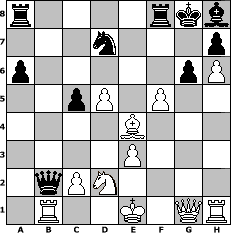 game notation in PGN-format [Event "Sommerrunden"] [Site "www.myChess.de"] [Date "2005.05.30"] [Round "1"] [White "bane"] [Black "PluckyDuck"] [ECO "A40"] [WhitemyELO "1773"] [BlackmyELO "1542"] [Result "1-0"] [TimeControl "10/1728000"] [WhiteDays "20"] [BlackDays "20"] [MyChessNo "13704"] 1. d4 e5 2. d5 Nf6 3. Nc3 d6 4. e4 g6 5. h3 Bg7 6. g4 O-O 7. Be3 c6 8. Be2 c5 9. h4 a6 10. g5 Nfd7 11. h5 b5 12. Nf3 b4 13. Nb1 Nb6 14. h6 Bh8 15. a3 Bg4 16. axb4 Bxf3 17. Bxf3 Nc4 18. bxc5 Nxe3 19. fxe3 Qxg5 20. Qe2 dxc5 21. Nd2 Nd7 22. Qf2 f5 23. Qg1 Qf6 24. exf5 e4 25. Bxe4 Qxb2 26. Rb1 1-0 position notation in FEN-format r4rkb/3n3p/p5pP/2pP1P2/4B3/4P3/1qPN4/1R2K1QR - K - 1 26 Captured white pieces: ![]() ![]() ![]() ![]() ![]() ![]() ![]() ![]() ![]() ![]() ![]() ![]() ![]() ![]() ![]() Captured black pieces: ![]() ![]() ![]() ![]() ![]() ![]() ![]() ![]() ![]() ![]() ![]() ![]() ![]() ![]() ![]() Click on a captured piece in order to display the desired move!