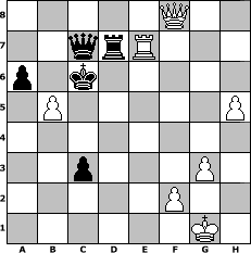 game notation in PGN-format [Event "Svetlana Open 2012"] [Site "www.myChess.de"] [Date "2012.03.22"] [Round "1"] [White "ClaudiaN"] [Black "woern63"] [ECO "B01"] [WhitemyELO "1871"] [BlackmyELO "1898"] [Result "1-0"] [TimeControl "10/2592000"] [WhiteDays "29"] [BlackDays "29"] [MyChessNo "80784"] 1. e4 d5 2. exd5 Qxd5 3. Nc3 Qa5 4. Nf3 Nf6 5. d4 Nc6 6. Bd2 a6 7. Bc4 Qh5 8. O-O Bg4 9. Be2 Qf5 10. h3 Bh5 11. Be3 O-O-O 12. Ng5 h6 13. Bxh5 hxg5 14. Bxf7 Nxd4 15. Bxd4 e5 16. Ne2 Qd7 17. Bxe5 Qxf7 18. Nd4 Bd6 19. Bxf6 gxf6 20. Qg4+ Kb8 21. c3 Rhe8 22. Rfd1 Be5 23. a3 c6 24. Nf3 Bc7 25. Qf5 Re2 26. Rxd8+ Bxd8 27. Nxg5 Qc4 28. Nf3 Rxb2 29. Rd1 Bb6 30. Nd4 Qa4 31. Rf1 Bxd4 32. Qf4+ Ka7 33. h4 f5 34. cxd4 c5 35. h5 Rb6 36. Qxf5 Qxd4 37. Rb1 Rd6 38. g3 c4 39. Qf3 b5 40. Kg2 Kb6 41. Rh1 Qd2 42. a4 Qg5 43. Qa8 Qg7 44. Qb8+ Kc5 45. Re1 Kc6 46. Kg1 Qc7 47. Qf8 c3 48. Re7 Rd7 49. axb5+ 1-0 position notation in FEN-format 5Q2/2qrR3/p1k5/1P5P/8/2p3P1/5P2/6K1 - - - 0 49 Captured white pieces: ![]() ![]() ![]() ![]() ![]() ![]() ![]() ![]() ![]() ![]() ![]() ![]() ![]() ![]() ![]() Captured black pieces: ![]() ![]() ![]() ![]() ![]() ![]() ![]() ![]() ![]() ![]() ![]() ![]() ![]() ![]() ![]() Click on a captured piece in order to display the desired move!