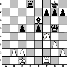 game notation in PGN-format [Event "3. Norderstedter DENK MAL Open 2012"] [Site "www.myChess.de"] [Date "2012.02.08"] [Round "1"] [White "borsti"] [Black "BobbyF4"] [ECO "C22"] [WhitemyELO "1222"] [BlackmyELO "1531"] [Result "0-1"] [TimeControl "10/2592000"] [WhiteDays "30"] [BlackDays "26"] [MyChessNo "79850"] 1. e4 e5 2. d4 exd4 3. Qxd4 Nc6 4. Qd1 Bc5 5. Nf3 Qf6 6. Qe2 Nge7 7. a3 Ne5 8. Nc3 c6 9. Be3 Bxe3 10. Nxe5 Bxf2+ 11. Qxf2 Qxe5 12. O-O-O O-O 13. Bd3 d6 14. g3 Ng6 15. Rhf1 Bg4 16. Be2 Bh3 17. Rfe1 Rad8 18. Qxa7 b5 19. Qd4 Qe7 20. Bf3 c5 21. Qd5 Be6 22. Qc6 Ne5 23. Rf1 Nxc6 24. e5 b4 25. axb4 Nxb4 26. Bd5 Nxd5 27. Nxd5 Qg5+ 28. Nf4 dxe5 29. Rxd8 Rxd8 0-1 position notation in FEN-format 3r2k1/5ppp/4b3/2p1p1q1/5N2/6P1/1PP4P/2K2R2 - - - 0 30 Captured white pieces: ![]() ![]() ![]() ![]() ![]() ![]() ![]() ![]() ![]() ![]() ![]() ![]() ![]() ![]() ![]() Captured black pieces: ![]() ![]() ![]() ![]() ![]() ![]() ![]() ![]() ![]() ![]() ![]() ![]() ![]() ![]() ![]() Click on a captured piece in order to display the desired move!