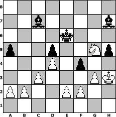 game notation in PGN-format [Event "F"] [Site "www.myChess.de"] [Date "2012.08.21"] [Round "1"] [White "Andylein1989"] [Black "Haki"] [ECO "C00"] [WhitemyELO "1551"] [BlackmyELO "1320"] [Result "1-0"] [TimeControl "10/864000"] [WhiteDays "10"] [BlackDays "10"] [MyChessNo "83396"] 1. e4 e6 2. Nf3 d5 3. exd5 exd5 4. d4 Nf6 5. Bf4 Nc6 6. Bb5 Bb4+ 7. c3 Ba5 8. O-O O-O 9. Bxc6 bxc6 10. Qa4 Bb6 11. Qxc6 Bd7 12. Qb7 a5 13. Bg5 c6 14. Ne5 Ra7 15. Nxc6 Rxb7 16. Nxd8 Rxd8 17. Bxf6 gxf6 18. Nd2 f5 19. Nf3 f6 20. Rfe1 Re8 21. Nh4 Re4 22. Nf3 f4 23. Nd2 Rxe1+ 24. Rxe1 Kf7 25. g3 fxg3 26. hxg3 h5 27. Re3 Rb8 28. Kg2 Re8 29. Rxe8 Bxe8 30. Nf1 Ke6 31. Ne3 Bg6 32. Kh3 f5 33. Ng2 Bc7 34. Nh4 Bh7 35. Nf3 f4 36. Ng5+ 1-0 position notation in FEN-format 8/2b4b/4k3/p2p2Np/3P1p2/2P3PK/PP2PP2/8 - - - 1 36 Captured white pieces: Captured black pieces: Click on a captured piece in order to display the desired move!