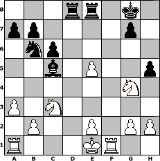 game notation in PGN-format [Event "MySchachOpen"] [Site "www.myChess.de"] [Date "2005.01.22"] [Round "1"] [White "Pinguin"] [Black "Robur"] [ECO "B03"] [WhitemyELO "1502"] [BlackmyELO "1655"] [Result "0-1"] [TimeControl "10/2592000"] [WhiteDays "77"] [BlackDays "77"] [MyChessNo "9865"] 1. e4 Nf6 2. e5 Nd5 3. d4 d6 4. c4 Nb6 5. f4 dxe5 6. fxe5 Nc6 7. Be3 Bf5 8. Nc3 e6 9. Nf3 Be7 10. d5 exd5 11. cxd5 Nb4 12. Nd4 N4xd5 13. Nxf5 Nxe3 14. Qxd8+ Rxd8 15. Nxe3 O-O 16. a3 Rfe8 17. Bb5 c6 18. Bc4 Bc5 19. Bxf7+ Kxf7 20. Rf1+ Kg8 21. Ng4 h5 0-1 position notation in FEN-format 3rr1k1/pp4p1/1np5/2b1P2p/6N1/P1N5/1P2P1PP/R3KR2 - Q - 0 22 Captured white pieces: Captured black pieces: Click on a captured piece in order to display the desired move!