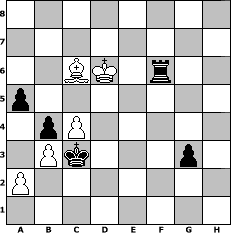 game notation in PGN-format [Event "Sweschnikow II"] [Site "www.myChess.de"] [Date "2012.04.28"] [Round "1"] [White "Joschi"] [Black "Naunhofer"] [ECO "B33"] [WhitemyELO "1651"] [BlackmyELO "1640"] [Result "0-1"] [TimeControl "10/1728000"] [WhiteDays "20"] [BlackDays "20"] [MyChessNo "81307"] 1. e4 c5 2. Nf3 Nc6 3. d4 cxd4 4. Nxd4 Nf6 5. Nc3 e5 6. Ndb5 d6 7. Bg5 a6 8. Na3 Be7 9. Bxf6 Bxf6 10. Nd5 b5 11. c4 b4 12. Nc2 a5 13. b3 O-O 14. Be2 g6 15. O-O Bg7 16. Bg4 Be6 17. Nce3 h5 18. Be2 Nd4 19. Rc1 f5 20. exf5 Bxf5 21. Nxf5 Rxf5 22. Bd3 Rg5 23. f4 exf4 24. Nxf4 Qe8 25. Qd2 Rg4 26. Rce1 Qf7 27. Nxh5 Nf3+ 28. Rxf3 Qxf3 29. Nxg7 Kxg7 30. h3 Qxh3 31. Re7+ Kf6 32. Re3 Rxg2+ 33. Qxg2 Qxe3+ 34. Qf2+ Qxf2+ 35. Kxf2 g5 36. Be4 Rf8 37. Kg3 Ke5 38. Bd5 Rf4 39. Bc6 Kd4 40. Ba4 Rf1 41. Kg4 Rg1+ 42. Kf3 Kc3 43. Ke4 Rf1 44. Kd5 g4 45. Kxd6 g3 46. Bc6 Rf6+ 0-1 position notation in FEN-format 8/8/2BK1r2/p7/1pP5/1Pk3p1/P7/8 - - - 2 47 Captured white pieces: Captured black pieces: Click on a captured piece in order to display the desired move!