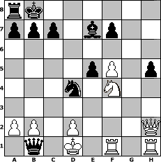 game notation in PGN-format [Event "960 f"] [Site "www.myChess.de"] [Date "2007.10.13"] [Round "2"] [White "tecker2010"] [Black "muetoe"] [Variant "Fischerrandom"] [SetUp "1"] [FEN "rkrbqnbn/pppppppp/8/8/8/8/PPPPPPPP/RKRBQNBN w KQkq - 0 1"] [WhitemyELO "1500"] [BlackmyELO "1821"] [Result "0-1"] [TimeControl "10/3456000"] [WhiteDays "120"] [BlackDays "120"] [MyChessNo "38891"] 1. e4 e5 2. Nhg3 Nhg6 3. Bg4 Nf4 4. f3 Nxg2 5. Qf2 Nf4 6. h3 g6 7. Bh2 h5 8. Bf5 gxf5 9. Nxf5 N8g6 10. N1e3 Nxh3 11. Qg2 Nhf4 12. Bxf4 Nxf4 13. Qh2 Bh7 14. Ng7 Qh8 15. Rg1 Bg6 16. Ngf5 d5 17. Ng4 Bxf5 18. exf5 Be7 19. Rh1 Qg7 20. Ne3 Rg8 21. c3 Qg3 22. Kc2 Qxf3 23. Raf1 Qe4+ 24. Kc1 d4 25. cxd4 Rg2 26. Nxg2 Ne2+ 27. Kd1 Nxd4 28. Nf4 Qb1# 0-1 position notation in FEN-format rk6/ppp1bp2/8/4pP1p/3n1N2/8/PP1P3Q/1q1K1R1R - q - 2 29 Captured white pieces: Captured black pieces: Click on a captured piece in order to display the desired move!
