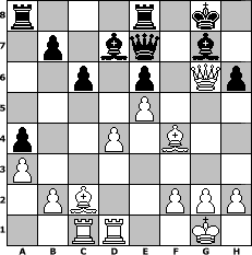 game notation in PGN-format [Event "Fernschachmeisterschaft Sfr. Heimersheim 2007"] [Site "www.myChess.de"] [Date "2007.01.21"] [Round "2"] [White "MisterBean"] [Black "stefan"] [ECO "D53"] [WhitemyELO "1786"] [BlackmyELO "1756"] [Result "1/2-1/2"] [TimeControl "10/2592000"] [WhiteDays "27"] [BlackDays "21"] [MyChessNo "31882"] 1. d4 d5 2. c4 e6 3. Nc3 Nf6 4. Bg5 Be7 5. Nf3 O-O 6. Rc1 c6 7. e3 h6 8. Bh4 Nbd7 9. Bd3 dxc4 10. Bxc4 Nd5 11. Bg3 N7f6 12. Qc2 Re8 13. a3 Nxc3 14. Qxc3 Bd7 15. Bd3 Nd5 16. Qd2 Bf6 17. O-O a5 18. e4 Nc7 19. Rfd1 a4 20. Bc2 Be7 21. Qd3 g6 22. Ne5 Bf8 23. Nxf7 Kxf7 24. Bxc7 Qg5 25. Qf3+ Kg8 26. Bf4 Qf6 27. Qg3 Bg7 28. e5 Qe7 29. Qxg6 1/2-1/2 position notation in FEN-format r3r1k1/1p1bq1b1/2p1p1Qp/4P3/p2P1B2/P7/1PB2PPP/2RR2K1 - - - 0 29 Captured white pieces: ![]() ![]() ![]() ![]() ![]() ![]() ![]() ![]() ![]() ![]() ![]() ![]() ![]() ![]() ![]() Captured black pieces: ![]() ![]() ![]() ![]() ![]() ![]() ![]() ![]() ![]() ![]() ![]() ![]() ![]() ![]() ![]() Click on a captured piece in order to display the desired move!