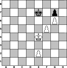 game notation in PGN-format [Event "Ostdeutschland"] [Site "www.myChess.de"] [Date "2008.08.12"] [Round "1"] [White "Pinguin"] [Black "ujack1961"] [ECO "C65"] [WhitemyELO "1544"] [BlackmyELO "1675"] [Result "1/2-1/2"] [TimeControl "10/2592000"] [WhiteDays "127"] [BlackDays "146"] [MyChessNo "47099"] 1. e4 e5 2. Nf3 Nc6 3. Bb5 Nf6 4. O-O a6 5. Bxc6 dxc6 6. d4 exd4 7. e5 Ng8 8. Bg5 Be7 9. Bxe7 Nxe7 10. Qxd4 O-O 11. Rd1 Bf5 12. c4 Bxb1 13. Raxb1 Qxd4 14. Rxd4 Rad8 15. Rbd1 Rxd4 16. Rxd4 c5 17. Rd7 Ng6 18. Rxc7 Rd8 19. Kf1 Nf4 20. g3 Nd3 21. Rxb7 h6 22. Rb6 a5 23. b3 Nc1 24. Rb5 Rd1+ 25. Kg2 Nxa2 26. Rxc5 Nc1 27. Rxa5 Nxb3 28. Rb5 Nd4 29. Nxd4 Rxd4 30. c5 Rc4 31. f4 Kf8 32. Kf3 Ke7 33. Ke3 Ke6 34. Kd3 Rc1 35. Rb6+ Kd5 36. c6 Rxc6 37. Rxc6 Kxc6 38. Kd4 f6 39. f5 Kd7 40. Kd5 fxe5 41. Kxe5 Ke7 42. g4 Kf7 43. h4 Ke7 44. g5 hxg5 45. hxg5 Kf7 46. g6+ Ke7 47. Ke4 Ke8 48. Ke5 Ke7 49. Ke4 1/2-1/2 position notation in FEN-format 8/4k1p1/6P1/5P2/4K3/8/4P3/8 - - - 6 49 Captured white pieces: ![]() ![]() ![]() ![]() ![]() ![]() ![]() ![]() ![]() ![]() ![]() ![]() ![]() ![]() ![]() Captured black pieces: ![]() ![]() ![]() ![]() ![]() ![]() ![]() ![]() ![]() ![]() ![]() ![]() ![]() ![]() ![]() Click on a captured piece in order to display the desired move!