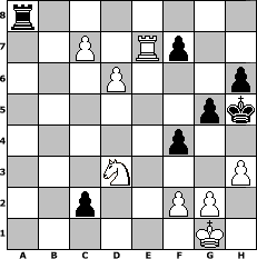 game notation in PGN-format [Event "Gegen die Herbstdepression"] [Site "www.myChess.de"] [Date "2008.12.01"] [Round "2"] [White "rux"] [Black "Helmut48"] [ECO "A21"] [WhitemyELO "1378"] [BlackmyELO "1394"] [Result "1-0"] [TimeControl "10/864000"] [WhiteDays "10"] [BlackDays "10"] [MyChessNo "50389"] 1. c4 e5 2. Nc3 a6 3. e4 c6 4. a3 h6 5. Nf3 d6 6. h3 Nf6 7. d4 Nbd7 8. d5 cxd5 9. cxd5 Nc5 10. Bd3 b5 11. b4 Nxd3+ 12. Qxd3 Bb7 13. Be3 Rc8 14. a4 bxa4 15. Rxa4 Qc7 16. Bd2 Be7 17. O-O O-O 18. Rc1 Qd7 19. Rca1 Ra8 20. Ra5 Rfc8 21. R5a3 g5 22. Nh2 Nh5 23. Qf3 Nf4 24. Bxf4 exf4 25. Qh5 Kg7 26. Ng4 Rh8 27. e5 Raf8 28. b5 axb5 29. Ra7 b4 30. Rb1 bxc3 31. Rbxb7 Qf5 32. Rxe7 Qg6 33. Qxg6+ Kxg6 34. Rac7 Rc8 35. exd6 c2 36. Ne5+ Kh5 37. Nd3 Rxc7 38. dxc7 Ra8 39. d6 1-0 position notation in FEN-format r7/2P1Rp2/3P3p/6pk/5p2/3N3P/2p2PP1/6K1 - - - 0 39 Captured white pieces: ![]() ![]() ![]() ![]() ![]() ![]() ![]() ![]() ![]() ![]() ![]() ![]() ![]() ![]() ![]() Captured black pieces: ![]() ![]() ![]() ![]() ![]() ![]() ![]() ![]() ![]() ![]() ![]() ![]() ![]() ![]() ![]() Click on a captured piece in order to display the desired move!
