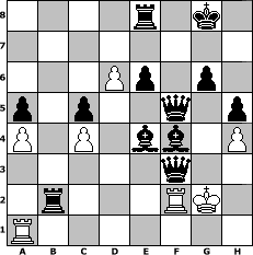 game notation in PGN-format [Event "Valjaux"] [Site "www.myChess.de"] [Date "2025.07.23"] [Round "1"] [White "Achimkogge"] [Black "Haneken"] [ECO "A06"] [WhitemyELO "1216"] [BlackmyELO "1123"] [Result "0-1"] [TimeControl "10/2592000"] [WhiteDays "143"] [BlackDays "129"] [MyChessNo "133527"] 1. Nf3 d5 2. d4 e6 3. c3 Bd6 4. b4 Nc6 5. e3 Nge7 6. Ng5 O-O 7. Bd3 g6 8. f4 h6 9. N5f3 Nf5 10. g3 Qf6 11. Bxf5 Qxf5 12. a3 b6 13. h3 b5 14. g4 Qe4 15. O-O a6 16. Kg2 f5 17. gxf5 Rxf5 18. h4 h5 19. Qe2 a5 20. Qxb5 Ba6 21. Qxc6 Ra7 22. Qe8+ Rf8 23. Rf2 Rxe8 24. Kg3 Qf5 25. Nh2 Bc4 26. Nd2 Bd3 27. b5 Bxb5 28. a4 Bd3 29. e4 dxe4 30. Ra2 Rb7 31. c4 c5 32. d5 Rb4 33. Bb2 e3 34. Rf3 exd2 35. Ra1 Rxb2 36. Rf2 Bb1 37. Rf1 Bc2 38. Kg2 Bxf4 39. d6 Be4+ 40. Nf3 d1=Q+ 41. Rf2 Qxf3+ 0-1 position notation in FEN-format 4r1k1/8/3Pp1p1/p1p2q1p/P1P1bb1P/5q2/1r3RK1/R7 - - - 0 42 Captured white pieces: Captured black pieces: Click on a captured piece in order to display the desired move!