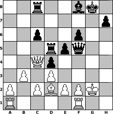 game notation in PGN-format [Event "Love, Peace and Harmony 1"] [Site "www.myChess.de"] [Date "2010.05.08"] [Round "1"] [White "Zargoz"] [Black "reisender"] [ECO "C60"] [WhitemyELO "1515"] [BlackmyELO "1413"] [Result "0-1"] [TimeControl "10/864000"] [WhiteDays "00"] [BlackDays "26"] [MyChessNo "65450"] 1. e4 e5 2. Nf3 Nc6 3. Bb5 Nge7 4. d3 d6 5. h3 g6 6. Bg5 Bg7 7. Bxc6+ bxc6 8. Nbd2 O-O 9. Nh4 Rb8 10. b3 d5 11. O-O Be6 12. Ndf3 d4 13. Qd2 Qd7 14. Qa5 f6 15. Bd2 g5 16. Nf5 Nxf5 17. exf5 Bxf5 18. Qxa7 g4 19. Nh4 gxh3 20. Nxf5 Qxf5 21. Qxc7 Rbc8 22. Qd6 hxg2 23. Kxg2 Rfd8 24. Qc5 Bf8 25. Qc4+ Rd5 0-1 position notation in FEN-format 2r2bk1/7p/2p2p2/3rpq2/2Qp4/1P1P4/P1PBPPK1/R4R2 - - - 5 26 Captured white pieces: Captured black pieces: Click on a captured piece in order to display the desired move!