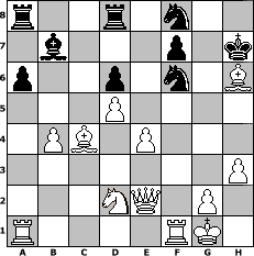 | game notation in PGN-format [Event "5 Jahre Wikinger"] [Site "www.myChess.de"] [Date "2009.12.13"] [Round "1"] [White "Andreas"] [Black "Knight"] [ECO "C44"] [WhitemyELO "1517"] [BlackmyELO "1131"] [Result "1-0"] [TimeControl "10/864000"] [WhiteDays "10"] [BlackDays "10"] [MyChessNo "61492"] 1. e4 e5 2. Nf3 Nc6 3. d4 Bb4+ 4. c3 Ba5 5. d5 Nb8 6. Bc4 d6 7. O-O Nf6 8. Bg5 O-O 9. Nbd2 Nbd7 10. a4 Nc5 11. b4 Bxb4 12. cxb4 Ncd7 13. a5 a6 14. h3 h6 15. Bh4 g5 16. Bg3 b5 17. axb6 g4 18. bxc7 gxf3 19. cxd8=Q Rxd8 20. Qxf3 Bb7 21. Qe2 Kh7 22. f4 exf4 23. Bxf4 Nf8 24. Bxh6 1-0 position notation in FEN-format r2r1n2/1b3p1k/p2p1n1B/3P4/1PB1P3/7P/3NQ1P1/R4RK1 - - - 0 24 Captured white pieces:                              Captured black pieces:                               Click on a captured piece in order to display the desired move!