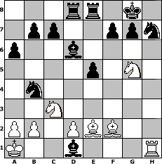 game notation in PGN-format [Event "ZEPPELIN-OPEN-2014-02"] [Site "www.myChess.de"] [Date "2014.10.13"] [Round "1"] [White "Knight"] [Black "Grubengeist"] [ECO "D00"] [WhitemyELO "1346"] [BlackmyELO "1887"] [Result "0-1"] [TimeControl "10/3456000"] [WhiteDays "40"] [BlackDays "39"] [MyChessNo "96352"] 1. d4 d5 2. e4 dxe4 3. Nc3 Nf6 4. f3 exf3 5. Qxf3 Qxd4 6. Be3 Qg4 7. Qf2 e5 8. Be2 Qf5 9. O-O-O Qxf2 10. Bxf2 a6 11. Nf3 Nc6 12. h3 Bd6 13. g4 h6 14. Rhg1 Be6 15. Kb1 O-O 16. g5 hxg5 17. Nxg5 Bf5 18. h4 Rad8 19. Rh1 Rfe8 20. h5 Nb4 21. h6 Bxc2+ 22. Ka1 Bxd1 23. h7+ Nxh7 0-1 position notation in FEN-format 3rr1k1/1pp2ppn/p2b4/4p1N1/1n6/2N5/PP1PBB2/K2b3R - - - 0 24 Captured white pieces: Captured black pieces: Click on a captured piece in order to display the desired move!