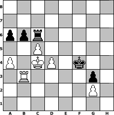 game notation in PGN-format [Event "1. Fr"] [Site "www.myChess.de"] [Date "2009.02.01"] [Round "1"] [White "werderfan"] [Black "sprinterde"] [ECO "A50"] [WhitemyELO "1461"] [BlackmyELO "1630"] [Result "1-0"] [TimeControl "10/864000"] [WhiteDays "50"] [BlackDays "50"] [MyChessNo "52244"] 1. d4 Nf6 2. c4 Nc6 3. Nc3 e6 4. Bg5 h6 5. Bh4 Bb4 6. e3 g5 7. Bg3 Ne4 8. Nge2 O-O 9. a3 Bxc3+ 10. Nxc3 Nxc3 11. bxc3 d6 12. h4 Qf6 13. hxg5 hxg5 14. Bd3 Rd8 15. f4 e5 16. Qh5 exf4 17. exf4 Re8+ 18. Kd2 gxf4 19. Qh7+ Kf8 20. Raf1 Bf5 21. Bxf5 fxg3 22. Qh8+ Qxh8 23. Rxh8+ Kg7 24. Rh7+ Kg8 25. Bd3 Re7 26. Rf3 f5 27. Rh5 f4 28. Rxf4 Rg7 29. c5 Ne7 30. cxd6 cxd6 31. Bc4+ d5 32. Bxd5+ Nxd5 33. Rxd5 Re8 34. Rff5 a6 35. Rg5 Ree7 36. Rxg7+ Rxg7 37. Re5 Kf7 38. Re3 Kf6 39. c4 Kf5 40. Kd3 Rg6 41. c5 b6 42. a4 Rc6 43. Kc4 Kf4 44. Rb3 1-0 position notation in FEN-format 8/8/ppr5/2P5/P1KP1k2/1R4p1/6P1/8 - - - 4 44 Captured white pieces: Captured black pieces: Click on a captured piece in order to display the desired move!