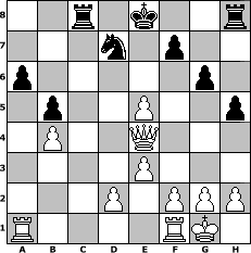 game notation in PGN-format [Event "wie w"] [Site "www.myChess.de"] [Date "2013.11.16"] [Round "1"] [White "Robur"] [Black "lotchi"] [ECO "D10"] [WhitemyELO "1806"] [BlackmyELO "1175"] [Result "1-0"] [TimeControl "10/1728000"] [WhiteDays "20"] [BlackDays "20"] [MyChessNo "91154"] 1. d4 d5 2. c4 c6 3. e3 Nf6 4. Nc3 Bg4 5. Nf3 e6 6. cxd5 exd5 7. Be2 Bb4 8. a3 Bxc3+ 9. bxc3 b5 10. O-O Bxf3 11. Bxf3 Nbd7 12. a4 a6 13. Bb2 Qc7 14. Ba3 h5 15. Qc2 g6 16. axb5 cxb5 17. Bxd5 Rc8 18. Bb4 Nxd5 19. Qe4+ Qe5 20. dxe5 Nxb4 21. cxb4 1-0 position notation in FEN-format 2r1k2r/3n1p2/p5p1/1p2P2p/1P2Q3/4P3/3P1PPP/R4RK1 - k - 0 21 Captured white pieces: Captured black pieces: Click on a captured piece in order to display the desired move!