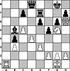 game notation in PGN-format [Event "Zwischendurch mal ein paar eigene Z"] [Site "www.myChess.de"] [Date "2009.06.25"] [Round "1"] [White "wiesel"] [Black "Knight"] [ECO "E11"] [WhitemyELO "1384"] [BlackmyELO "1131"] [Result "1/2-1/2"] [TimeControl "10/1728000"] [WhiteDays "49"] [BlackDays "58"] [MyChessNo "56942"] 1. d4 Nf6 2. c4 e6 3. Nf3 Bb4+ 4. Bd2 Bxd2+ 5. Nbxd2 d5 6. Qa4+ Nc6 7. e3 O-O 8. Bd3 Bd7 9. Qc2 Nb4 10. Qc3 Nxd3+ 11. Qxd3 Re8 12. Ne5 Ne4 13. Nxe4 dxe4 14. Qxe4 b6 15. O-O b5 16. c5 f5 17. Qb7 a5 18. Qf3 b4 19. b3 a4 20. Qh5 g6 21. Qh6 Re7 22. Nf3 axb3 23. axb3 Rxa1 24. Rxa1 Bb5 25. Ng5 1/2-1/2 position notation in FEN-format 3q2k1/2p1r2p/4p1pQ/1bP2pN1/1p1P4/1P2P3/5PPP/R5K1 - - - 2 25 Captured white pieces: Captured black pieces: Click on a captured piece in order to display the desired move!