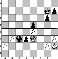 game notation in PGN-format [Event "Dabei ist alles 2"] [Site "www.myChess.de"] [Date "2008.04.04"] [Round "1"] [White "Andreas"] [Black "brucybabe"] [ECO "B32"] [WhitemyELO "1545"] [BlackmyELO "1538"] [Result "1/2-1/2"] [TimeControl "10/864000"] [WhiteDays "10"] [BlackDays "10"] [MyChessNo "44059"] 1. e4 c5 2. Nf3 Nc6 3. d4 cxd4 4. Nxd4 d6 5. Nxc6 bxc6 6. Bd3 g6 7. O-O Bg7 8. Kh1 Nf6 9. f4 O-O 10. Nc3 Nd7 11. Bd2 Nc5 12. Rb1 Nxd3 13. cxd3 Ba6 14. Qf3 e6 15. Rfc1 Rb8 16. b3 Bb7 17. Ne2 c5 18. h3 f5 19. Ng3 fxe4 20. dxe4 Bd4 21. Bc3 Qf6 22. Bxd4 cxd4 23. Rf1 Rbc8 24. Qg4 Kh8 25. Qe2 Rc3 26. Kh2 Qh4 27. Qf2 Rfc8 28. Rfd1 e5 29. fxe5 dxe5 30. Rbc1 Qd8 31. Ne2 Rxc1 32. Rxc1 Rxc1 33. Nxc1 Kg7 34. Nd3 Qe7 35. Qf3 Qf6 36. Qg4 Ba6 37. Qg3 Bxd3 38. Qxd3 Qf4+ 39. Kh1 Qc1+ 40. Kh2 Qc3 41. Qa6 d3 42. Qxa7+ Kh6 43. Qe3+ Kg7 1/2-1/2 position notation in FEN-format 8/6kp/6p1/4p3/4P3/1PqpQ2P/P5PK/8 - - - 3 44 Captured white pieces: Captured black pieces: Click on a captured piece in order to display the desired move!