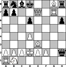 game notation in PGN-format [Event "Marshall\'s Chess Divan"] [Site "www.myChess.de"] [Date "2021.11.11"] [Round "1"] [White "zoli"] [Black "wolni55"] [ECO "C40"] [WhitemyELO "1939"] [BlackmyELO "1388"] [Result "1-0"] [TimeControl "10/2592000"] [WhiteDays "28"] [BlackDays "56"] [MyChessNo "123459"] 1. e4 e5 2. Nf3 Bc5 3. Bc4 h6 4. Nxe5 d5 5. Bxd5 Qe7 6. d4 Bd6 7. Nxf7 Rh7 8. Nxd6+ cxd6 9. Bxg8 Qxe4+ 10. Be3 Qxg2 11. Kd2 Rh8 12. Rg1 Qxh2 13. Rxg7 Kf8 14. Qf3+ Ke8 15. Qf7+ Kd8 16. Qe7# 1-0 position notation in FEN-format rnbk2Br/pp2Q1R1/3p3p/8/3P4/4B3/PPPKPP1q/RN6 - - - 6 16 Captured white pieces: ![]() ![]() ![]() ![]() ![]() ![]() ![]() ![]() ![]() ![]() ![]() ![]() ![]() ![]() ![]() Captured black pieces: ![]() ![]() ![]() ![]() ![]() ![]() ![]() ![]() ![]() ![]() ![]() ![]() ![]() ![]() ![]() Click on a captured piece in order to display the desired move!