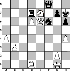 game notation in PGN-format [Event "Fr"] [Site "www.myChess.de"] [Date "2017.02.25"] [Round "1"] [White "UPS"] [Black "Knight"] [ECO "C44"] [WhitemyELO "1668"] [BlackmyELO "1228"] [Result "1-0"] [TimeControl "10/2592000"] [WhiteDays "107"] [BlackDays "150"] [MyChessNo "107159"] 1. e4 e5 2. Nf3 Nc6 3. d4 Qe7 4. d5 Nb8 5. Be2 d6 6. Nc3 Nf6 7. Bg5 Bg4 8. O-O Nbd7 9. h3 Bh5 10. Nb5 Qd8 11. Qd3 Be7 12. Nh2 Bxe2 13. Qxe2 O-O 14. Qc4 c6 15. dxc6 bxc6 16. Qxc6 Rc8 17. Qa6 Nc5 18. Qxa7 Ncxe4 19. Bxf6 Bxf6 20. c3 Re8 21. Qe3 d5 22. f4 h6 23. Ng4 exf4 24. Nxf6+ Qxf6 25. Rxf4 Qg5 26. h4 Qd8 27. Qd4 f6 28. Na3 Re5 29. Rd1 Nc5 30. Qd2 Ne4 31. Qc2 f5 32. Nb5 Nf6 33. Rxf5 Rxf5 34. Qxf5 Rb8 35. a4 Rb6 36. c4 Ra6 37. b3 Ra8 38. cxd5 Rc8 39. Qe6+ Kh8 40. Nd6 Qf8 41. Nf7+ Kh7 42. d6 Re8 43. Qf5+ Kg8 44. Ne5 Rd8 45. Qe6+ Kh7 46. Nc6 Rd7 47. Ne7 1-0 position notation in FEN-format 5q2/3rN1pk/3PQn1p/8/P6P/1P6/6P1/3R2K1 - - - 10 47 Captured white pieces: Captured black pieces: Click on a captured piece in order to display the desired move!