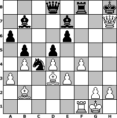 game notation in PGN-format [Event "Entdeckung der Langsamkeit III"] [Site "www.myChess.de"] [Date "2013.03.15"] [Round "1"] [White "Seneca"] [Black "Joschi"] [ECO "A45"] [WhitemyELO "1530"] [BlackmyELO "1600"] [Result "1-0"] [TimeControl "10/3456000"] [WhiteDays "104"] [BlackDays "119"] [MyChessNo "87102"] 1. d4 Nf6 2. e3 d5 3. Bd3 c5 4. c3 e6 5. Nd2 Nc6 6. a3 Be7 7. f4 Qc7 8. Ngf3 O-O 9. O-O a6 10. Ne5 cxd4 11. cxd4 b5 12. b4 Bb7 13. Ndf3 Rac8 14. Bb2 Ne8 15. Rc1 Qd8 16. Nxc6 Rxc6 17. Rxc6 Bxc6 18. Qc2 Bb7 19. Bxh7+ Kh8 20. Bd3 Nd6 21. Ne5 Nc4 22. Qe2 Kg8 23. Qh5 g6 24. Nxg6 fxg6 25. Qxg6+ Kh8 26. Qh7# 1-0 position notation in FEN-format 3q1r1k/1b2b2Q/p3p3/1p1p4/1PnP1P2/P2BP3/1B4PP/5RK1 - - - 2 26 Captured white pieces: Captured black pieces: Click on a captured piece in order to display the desired move!