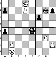 game notation in PGN-format [Event "nur so"] [Site "www.myChess.de"] [Date "2007.08.15"] [Round "2"] [White "Baehr008"] [Black "kischok46"] [ECO "A50"] [WhitemyELO "2143"] [BlackmyELO "2019"] [Result "1/2-1/2"] [TimeControl "10/864000"] [WhiteDays "08"] [BlackDays "60"] [MyChessNo "37379"] 1. d4 Nf6 2. c4 Nc6 3. Nf3 e6 4. g3 d5 5. cxd5 exd5 6. Bg2 Bb4+ 7. Bd2 O-O 8. Bxb4 Nxb4 9. O-O Re8 10. Nc3 c6 11. a3 Na6 12. Qc2 Be6 13. Rfe1 Nc7 14. Ne5 Qc8 15. e4 dxe4 16. Nxe4 Nb5 17. Rad1 Qc7 18. Nxf6+ gxf6 19. Nf3 Qd7 20. a4 Nc7 21. Nd2 Bd5 22. Ne4 Qf5 23. f3 Qg6 24. Qd2 f5 25. Nc5 b6 26. Nd7 Rxe1+ 27. Rxe1 Ne6 28. f4 Bxg2 29. Kxg2 Rd8 30. Ne5 Qh6 31. Nxc6 Nxf4+ 32. Qxf4 Qxc6+ 33. Kf2 Qd5 34. Qg5+ Kf8 35. Qh6+ Kg8 36. Rd1 Rc8 37. Rd2 Rc6 38. Qg5+ Rg6 39. Qf4 Qh1 40. Ke3 Re6+ 41. Kd3 Qd5 42. Kc3 Qa5+ 43. Kb3 b5 44. d5 Re4 45. Qg5+ Kh8 46. Rd4 bxa4+ 47. Ka2 Qb5 48. Qd2 Qb3+ 49. Ka1 Qb6 50. Rxe4 fxe4 51. d6 e3 52. Qd5 f6 53. d7 Qd8 54. Qe6 e2 55. Qe8+ Kg7 56. Qxd8 e1=Q+ 57. Ka2 Qe6+ 58. Kb1 Qe4+ 1/2-1/2 position notation in FEN-format 3Q4/p2P2kp/5p2/8/p3q3/6P1/1P5P/1K6 - - - 4 59 Captured white pieces: Captured black pieces: Click on a captured piece in order to display the desired move!