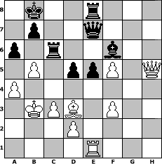 game notation in PGN-format [Event "Kellertunier"] [Site "www.myChess.de"] [Date "2005.08.15"] [Round "1"] [White "crca108"] [Black "MaxPayne"] [ECO "D01"] [WhitemyELO "1396"] [BlackmyELO "1406"] [Result "1-0"] [TimeControl "10/864000"] [WhiteDays "10"] [BlackDays "00"] [MyChessNo "16242"] 1. d4 d5 2. Nc3 Nf6 3. Bg5 e6 4. a3 Nc6 5. e3 Be7 6. Bb5 O-O 7. Qf3 Bd7 8. Qg3 a6 9. Bd3 Ne4 10. Nxe4 dxe4 11. Bxe4 Bxg5 12. h4 Bf6 13. h5 h6 14. f4 Rb8 15. Nf3 Ne7 16. O-O-O Nf5 17. Qf2 Bc6 18. Bd3 Bxf3 19. gxf3 Bh4 20. Qg2 Nxe3 21. Qe2 Nxd1 22. Kxd1 Bf6 23. Qe4 g6 24. Rg1 Re8 25. hxg6 fxg6 26. Qxg6+ Kf8 27. Qxh6+ Ke7 28. Qh7+ Kd6 29. c3 Qe7 30. Qh5 c6 31. Re1 Kc7 32. b4 Rbd8 33. d5 cxd5 34. Kc2 Kb8 35. f5 e5 36. a4 Rc8 37. Kb3 Rc6 38. b5 1-0 position notation in FEN-format 1k2r3/1p2q3/p1r2b2/1P1ppP1Q/P7/1KPB1P2/3P4/4R3 - - - 0 38 Captured white pieces: ![]() ![]() ![]() ![]() ![]() ![]() ![]() ![]() ![]() ![]() ![]() ![]() ![]() ![]() ![]() Captured black pieces: ![]() ![]() ![]() ![]() ![]() ![]() ![]() ![]() ![]() ![]() ![]() ![]() ![]() ![]() ![]() Click on a captured piece in order to display the desired move!