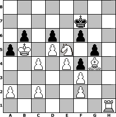 game notation in PGN-format [Event "Sommerpausen-F"] [Site "www.myChess.de"] [Date "2013.07.07"] [Round "1"] [White "beowulf"] [Black "borsti"] [ECO "A20"] [WhitemyELO "1423"] [BlackmyELO "1254"] [Result "1-0"] [TimeControl "10/2592000"] [WhiteDays "149"] [BlackDays "147"] [MyChessNo "89164"] 1. c4 e5 2. Nf3 d6 3. Nc3 Nf6 4. d4 Bg4 5. h3 Bxf3 6. gxf3 Nh5 7. e3 Nc6 8. d5 Ne7 9. e4 Nf4 10. Bxf4 exf4 11. Qd2 g5 12. O-O-O Bg7 13. Rg1 h6 14. h4 Bf6 15. hxg5 hxg5 16. Bg2 Qd7 17. Rh1 Ng6 18. Rxh8+ Bxh8 19. Rh1 Qe7 20. Bh3 Nh4 21. Bg4 Be5 22. Nb5 a6 23. Nc3 Qf8 24. Ne2 Qg7 25. Ng1 a5 26. Nh3 Ke7 27. Ng1 b6 28. Ne2 Bxb2+ 29. Qxb2 Qxb2+ 30. Kxb2 f6 31. Nd4 Kf7 32. Nb5 Rh8 33. Nxc7 Ke7 34. Ne6 Rc8 35. Kb3 Rb8 36. Nd4 Rc8 37. Bxc8 Kd8 38. Bg4 Ke7 39. Nc6+ Kf7 40. Ka4 Ng6 41. Kb5 Ne5 42. Nxe5+ 1-0 position notation in FEN-format 8/5k2/1p1p1p2/pK1PN1p1/2P1PpB1/5P2/P1P2P2/7R - - - 0 42 Captured white pieces: Captured black pieces: Click on a captured piece in order to display the desired move!