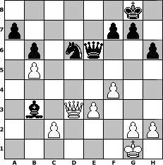 game notation in PGN-format [Event "Pott Schach - Glück Auf die xte."] [Site "www.myChess.de"] [Date "2020.11.05"] [Round "1"] [White "beowulf"] [Black "hsvler"] [ECO "A15"] [WhitemyELO "1399"] [BlackmyELO "1547"] [Result "0-1"] [TimeControl "10/2592000"] [WhiteDays "120"] [BlackDays "074"] [MyChessNo "119746"] 1. c4 Nf6 2. d4 e6 3. Nc3 Be7 4. Nf3 O-O 5. Bg5 Nc6 6. e3 b6 7. Bd3 h6 8. Bh4 Nb4 9. O-O Nxd3 10. Qxd3 Bb7 11. d5 exd5 12. Nxd5 Nxd5 13. Bxe7 Nxe7 14. Nd4 Ba6 15. b3 d5 16. Nb5 dxc4 17. Qxc4 c6 18. Rad1 Qb8 19. a4 cxb5 20. axb5 Bb7 21. Rd7 Bd5 22. Qd3 Qe5 23. f4 Qe6 24. Rc7 Bxb3 25. Rc1 Rfd8 26. Qe2 Rac8 27. Rxc8 Rxc8 28. Rxc8+ Nxc8 29. Qd3 Nd6 0-1 position notation in FEN-format 6k1/p4pp1/1p1nq2p/1P6/5P2/1b1QP3/2P3PP/6K1 - - - 2 30 Captured white pieces: Captured black pieces: Click on a captured piece in order to display the desired move!