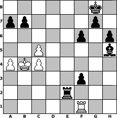 | game notation in PGN-format [Event "Mail"] [Site "www.myChess.de"] [Date "2012.05.01"] [Round "1"] [White "Knight"] [Black "Haki"] [ECO "A45"] [WhitemyELO "1218"] [BlackmyELO "1334"] [Result "0-1"] [TimeControl "10/864000"] [WhiteDays "10"] [BlackDays "10"] [MyChessNo "81383"] 1. d4 Nf6 2. Nc3 d5 3. e4 Nxe4 4. Nxe4 dxe4 5. Be3 e5 6. d5 c6 7. Bc4 Qd6 8. Ne2 Qb4+ 9. Qd2 Qxc4 10. dxc6 Qxc6 11. O-O-O Be7 12. Nc3 O-O 13. Qe1 Rd8 14. Rxd8+ Bxd8 15. Qd2 Nd7 16. h4 Ba5 17. h5 Bxc3 18. Qxc3 Qxc3 19. bxc3 h6 20. g4 f6 21. c4 Nb6 22. c5 Nd5 23. Bd2 Bxg4 24. c4 Nf4 25. Bxf4 exf4 26. Kc2 Re8 27. Kb3 e3 28. fxe3 Rxe3+ 29. Kb4 f3 30. Rf1 Bxh5 31. a4 Re2 0-1 position notation in FEN-format 6k1/pp4p1/5p1p/2P4b/PKP5/5p2/4r3/5R2 - - - 1 32 Captured white pieces:                              Captured black pieces:                               Click on a captured piece in order to display the desired move!